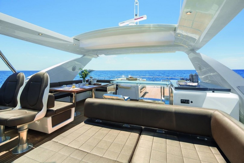 - Flybridge is very well-appointed, complete with an alfresco dining option, 2 large sunpads, full service station with BBQ, wet bar, deluxe Spa Pool tub and retractable roof, great for entertaining by day or night.