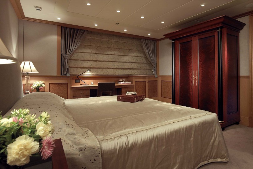 - Master suite occupies the entire upper deck, extending through a private lounge onto an outdoor dining terrace
