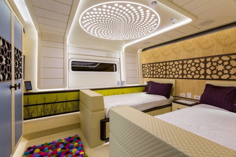 Send EnquiryDelivered in 2015, Khalilah is the first all carbon superyacht. She truly stands out, featuring distinctive lines and a gold livery with a sharp hull to cut through the waves. Her interior is just as distinctive as her exterior, with oak flooring, neutral furniture and colourful objects to make the room ‘pop’. The interior feels very light and open with floor to ceiling windows aiding in lighting the interior and giving a great view outside. Coming outside you will find many large sun pads and a table aft, great for al fresco dining. Khalilah also comes with a matching tender