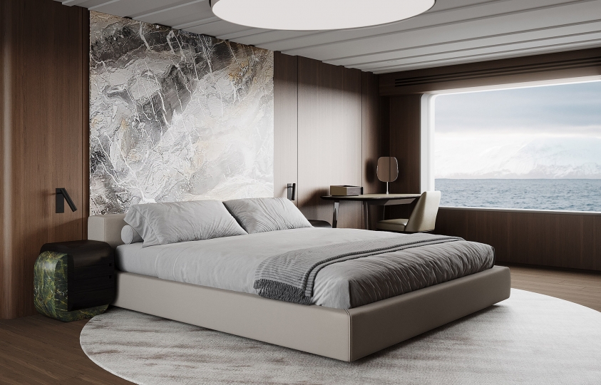 The contemporary, loft-style layout includes a spacious VIP stateroom on the main deck with a dedicated office space and fixed balcony, an Owner's cabin on the upper deck for incredible views and privacy, four deluxe guest cabins on the lower deck, and a wellness area complete with spa, sauna, and hammam. Guests can enjoy expansive outdoor spaces including the hot tub on the Owner's deck, as well as the generously large bridge and obseration decks, with space for gym equipment. A commercially certified helipad rated for 3,000 kg (D-value 12.7 m) provides seamless access in remote destinations.