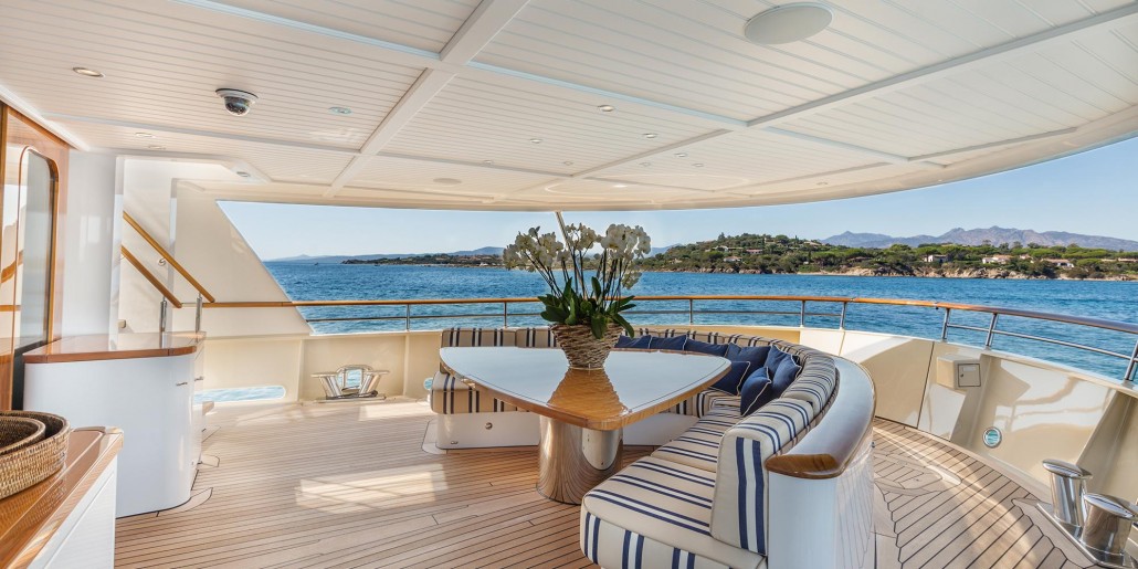 - Main deck saloon with lounge seating for ten and large sliding doors that can be opened to allow cooling winds to blow through the yacht